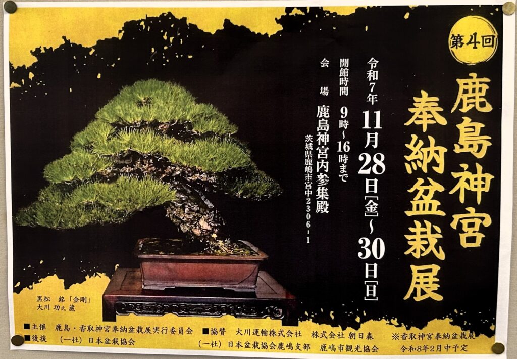 令和7年11月28日(金)~30日(日)の3日間、鹿島神宮・香取神宮奉納盆栽展実行委員会による「鹿島神宮 奉納盆栽展」が鹿島神宮参集殿で開催されました。また翌年、令和8年2月には「香取神宮奉納盆栽展」が香取神宮(香取市)神徳館にて香取神宮・鹿島神宮奉納盆栽展実行委員会による「香取神宮 奉納盆栽展」の催行を予定しております。