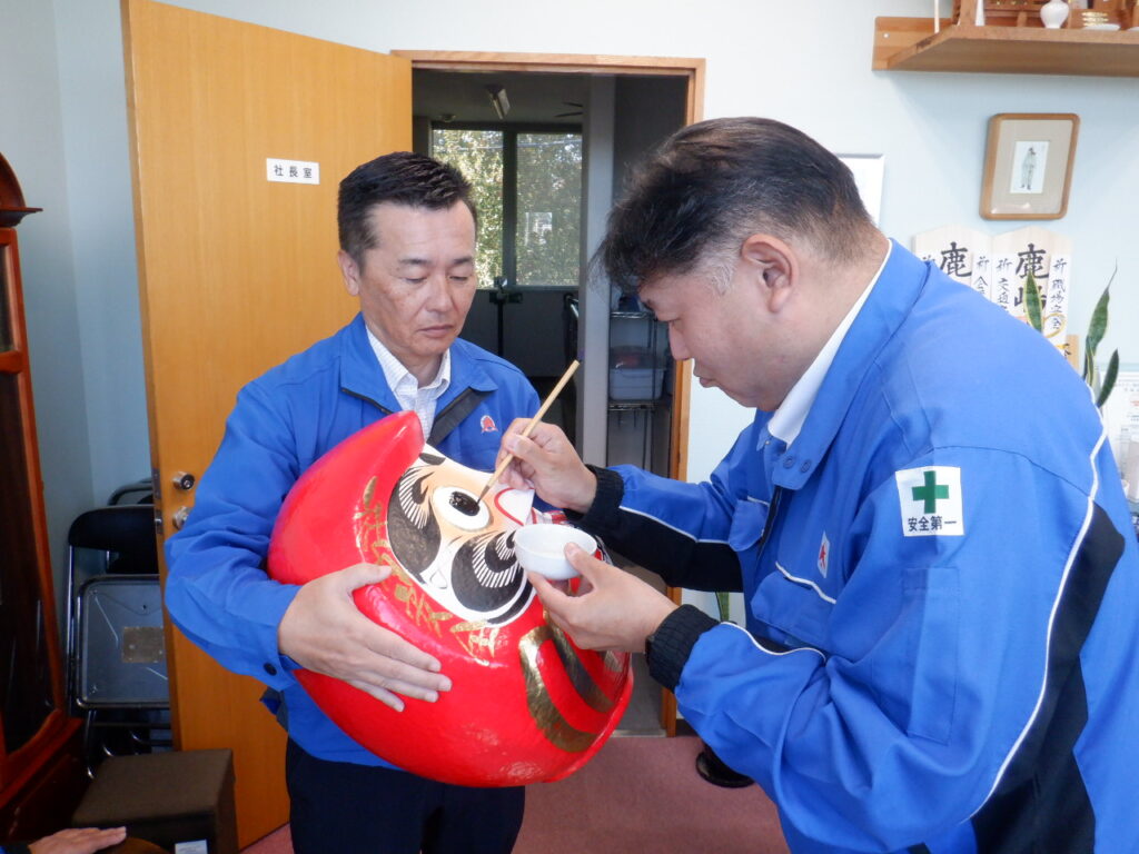 毎年恒例の達磨の目入れを役員や本社営業所の管理者が行いました。新年の縁起物として親しまれている「達磨の目入れ」ですが、