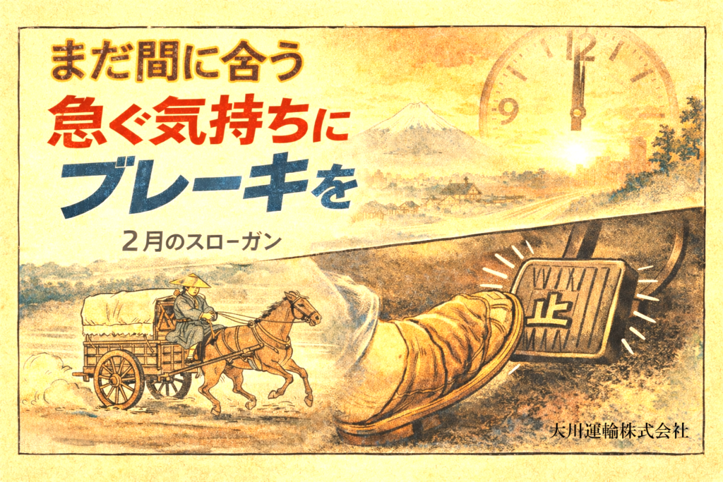 令和8年2月の安全スローガンは、”まだ間に合う 急ぐ気持ちに ブレーキを”です。