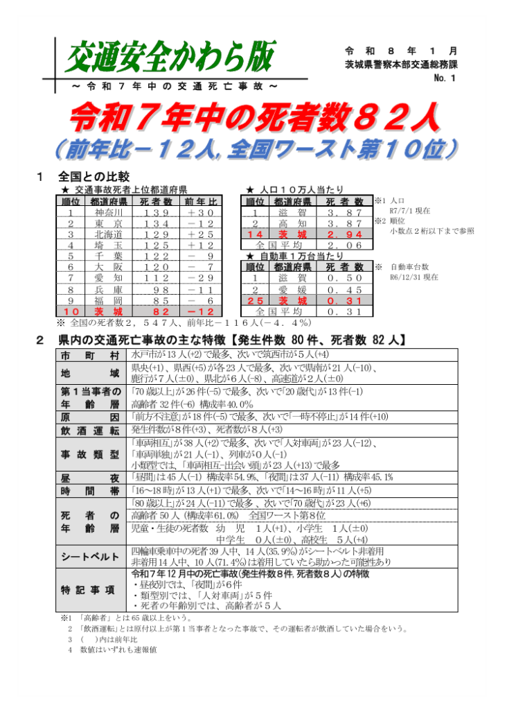 昨年、茨城県では死亡者数82人と、依然として厳しい状況が続いています。特に高齢者が関係する事故や、交差点・出会い頭事故の多さが目立ちます。日々ハンドルを握る私たちにとって、「慣れ」や「油断」が最も大きなリスクです。基本動作の徹底、早めの確認、ゆとりある運転を心がけ、無事故で帰れる毎日を全員で積み重ねていきましょう。