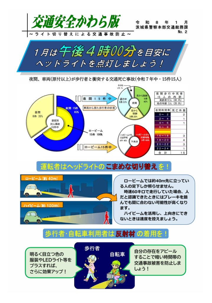 薄暮時間帯の事故防止に向けた重要なポイントを把握して事故防止に役立てましょう。特に1月は午後4時頃から急激に視界が悪くなり、歩行者との衝突事故が多発しています。早めのヘッドライト点灯と、こまめなロービーム・ハイビームの切り替えは、事故を防ぐ基本動作です。また、歩行者や自転車利用者の反射材着用も命を守る大切な行動です。運転者・歩行者双方が「見える・見せる」を意識し、夕暮れ時の安全確保に努めていきましょう。