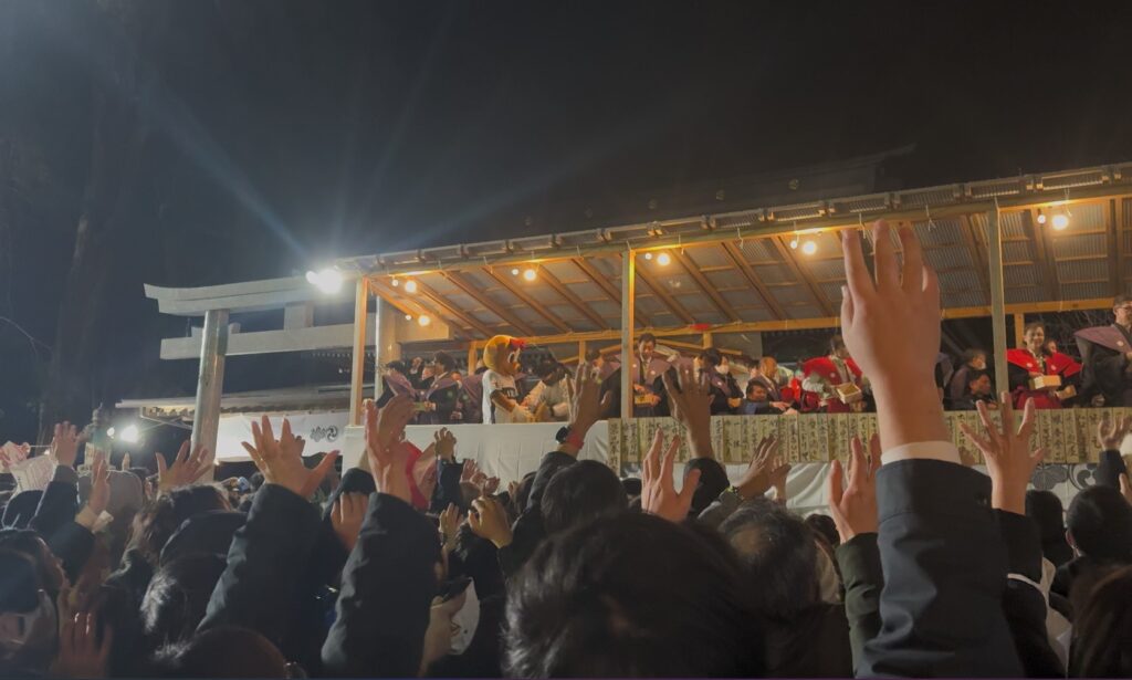 「福は内、鬼は外」の掛け声とともに豆まきが行われ、多くの参拝者で賑わいます。
