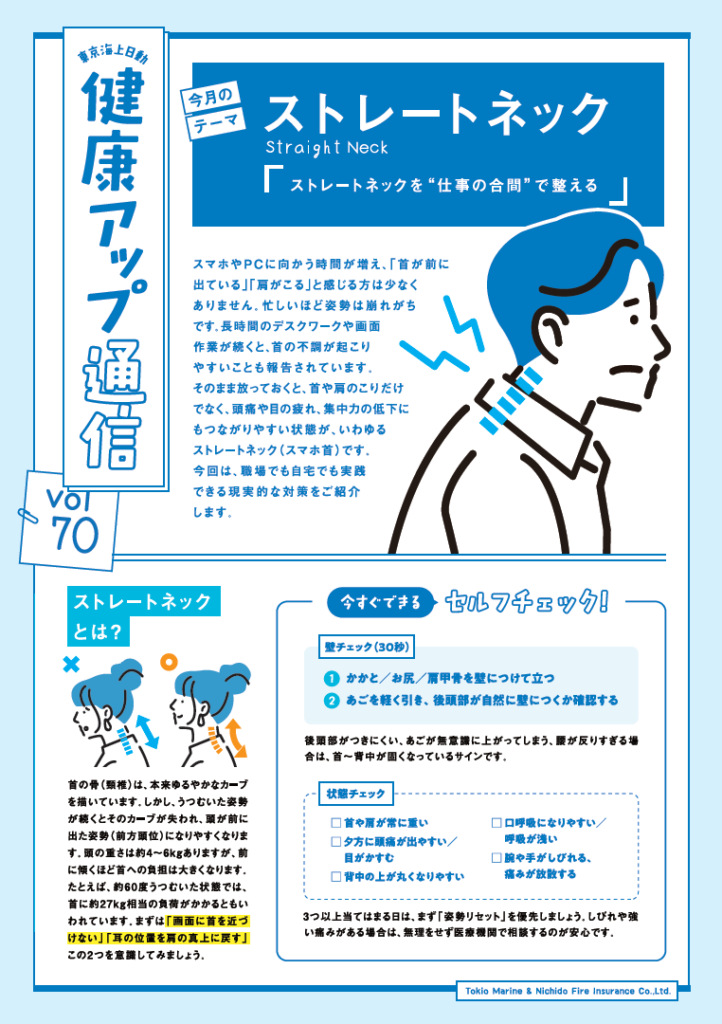 今月のテーマ「ストレートネック」は、日々ハンドルを握る私たちにとっても決して他人事ではありません。運転や点呼、事務作業など前かがみの姿勢が続くと、知らず知らずのうちに首や肩へ負担がかかります。首の不調は集中力の低下や判断ミスにもつながりかねません。記事で紹介されているセルフチェックや姿勢リセットを、仕事の合間にぜひ実践し、体のコンディションを整えて安全運行につなげていきましょう。
