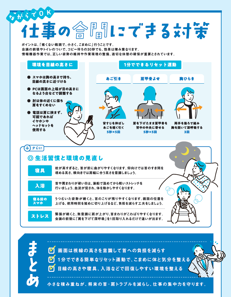 画面の高さを見直す、1分間のリセット運動を行うなど、どれもすぐに実践できる内容ばかりです。私たちの業務は運転や事務作業など同じ姿勢が続きがちですが、小さな心がけの積み重ねが首や肩の不調予防、そして集中力の維持につながります。日々の業務の中に無理なく取り入れ、心身のコンディションを整えて安全と品質の向上につなげていきましょう。